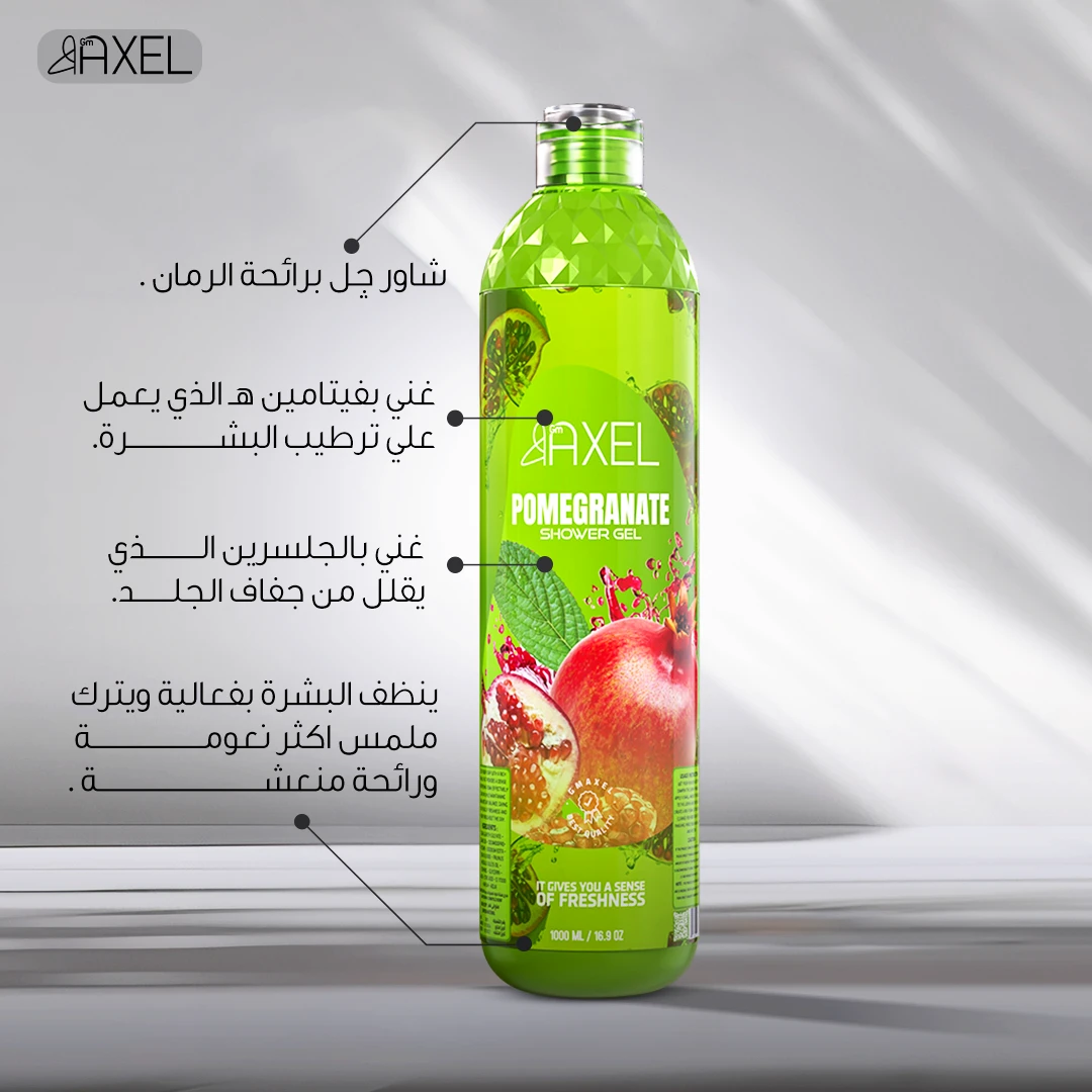 شاور جل برائحة الرمان - لتنظيف وترطيب البشرة بعمق مع لمسة فاكهية الوصف: شاور جل برائحة الرمان يمنحك تجربة استحمام مميزة، حيث ينظف البشرة بعمق ويرطبها بفضل تركيبته الفعالة. يوفر الانتعاش الذي تحتاجينه بعد يوم طويل، مما يجعل بشرتك ناعمة ورائحتها منعشة. المكونات: صوديوم لوريث سلفات - كوكاميد DEA - كوكاميدوبروبيل بيتين - ثنائي صوديوم EDTA - كلوريد الصوديوم - زيت اللوز الحلو - توكوفيرول - جلسرين - لانولين - حمض الستريك - CI 17200 - عطر - ماء. طريقة الاستخدام: ضعي كمية من الشاور جل على يديك أو الليفة، ودلكي الجسم بلطف للحصول على رغوة غنية. اشطفي بالماء جيدًا واستمتعي برائحة الرمان المنعشة. الحجم:1000مللي